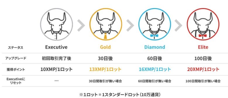 XMTradingでの取引日数が増えるほどステータスが上がっていき、もらえるXMPポイントが増えていきます。取引日数が長くなると、勝手にキャッシュバック金額も増えていくというサービスです。